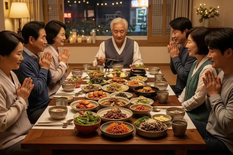 Na cultura coreana, o respeito aos mais velhos também se reflete na mesa: ninguém começa a comer antes da pessoa mais velha da mesa dar a primeira garfada. Além disso, as tigelas de arroz e sopa nunca devem ser levantadas da mesa enquanto você come.